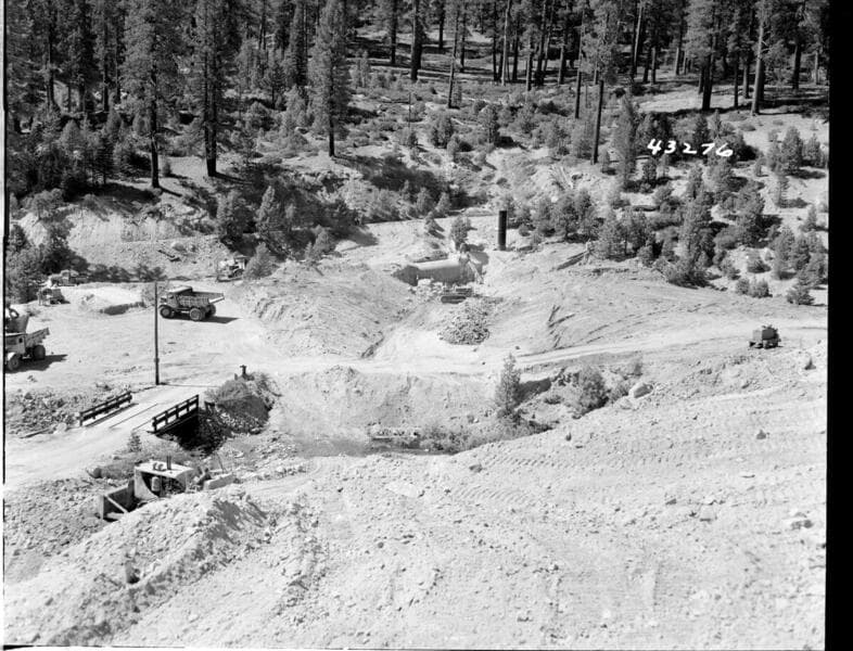 Big Creek, Huntington Lake Dams - Rancheria Creek near Portal Powerhouse, showing temporary road crossing, which also dams the flow of the creek.