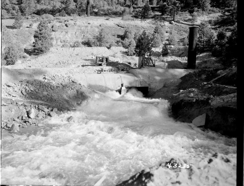 Portal Powerhouse - View of tunnel diversion during test flow of 490 cfs. Flow in diversion ditch from 12' pipe to junction with Rancheria Creek channel.