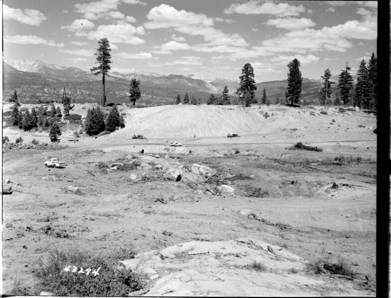 Portal Powerhouse - Forebay - View from left abutment showing progress in reservoir clearing and borrow pit stripping. Portion of new road location in background to right of center.