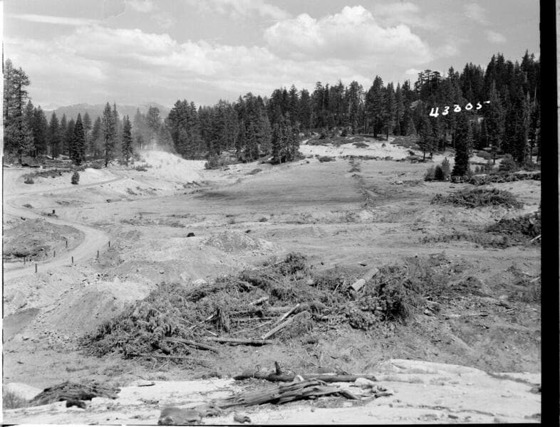 Portal Powerhouse - Forebay - View of portion of reservoir stripped for borrow and left section of damsite, from new Forest Service road.