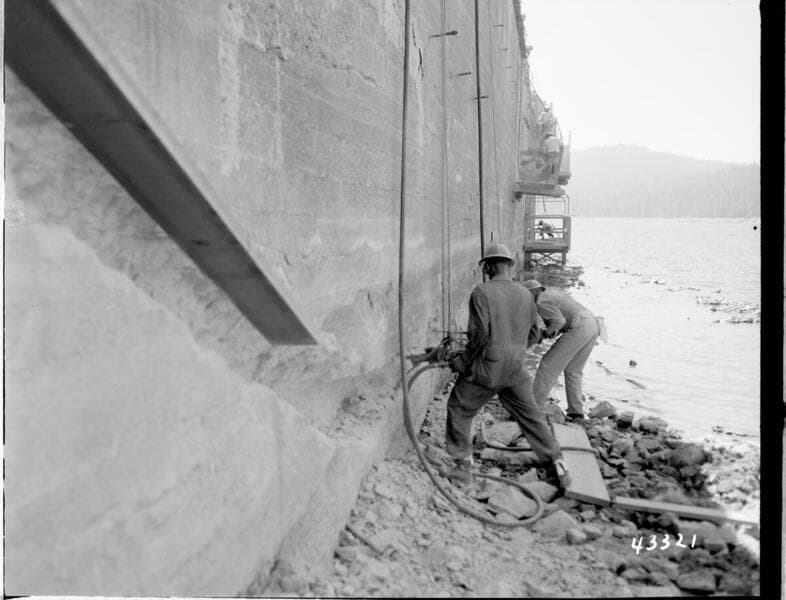 Big Creek, Huntington Lake Dams - Upstream protection - Steel facing being placed in test section at east end of Dam #1. Bottom of section at elvation 6930.