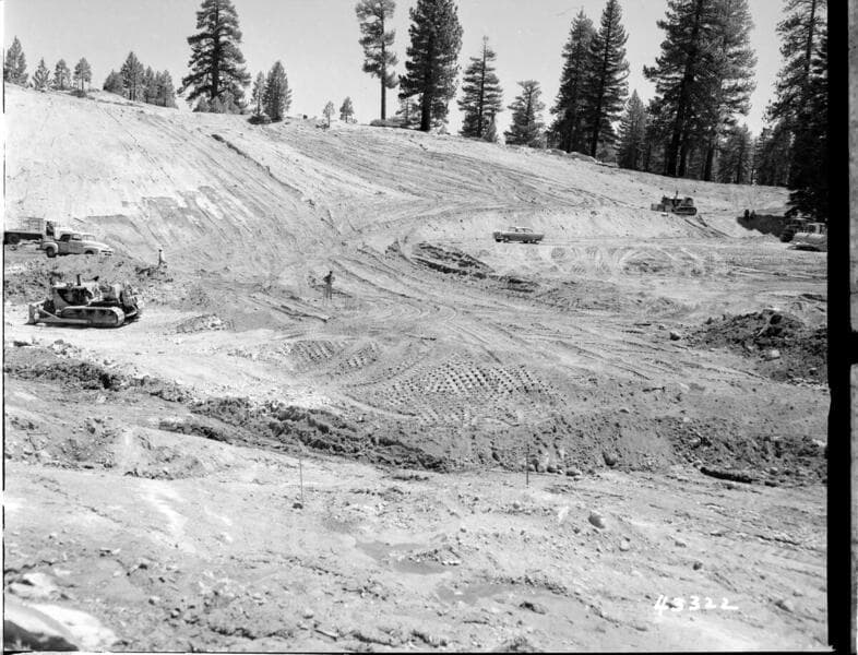 Portal Powerhouse - Forebay - Upstream toe of rock fill section of forebay dam showing pervious filter layer in place between rock fill and impervious sections of embankment.