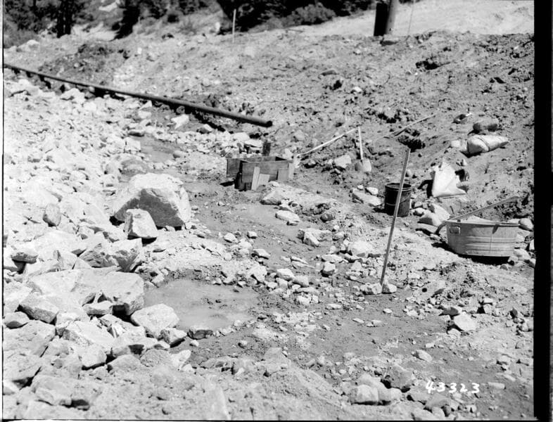 Portal Powerhouse - Portal Forebay - Downstream side of dam showing outlet end of 24" sluice pipe.