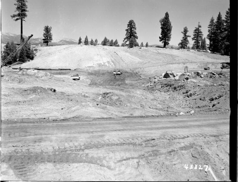 Portal Powerhouse - Forebay - Placing first fill in impervious section under location of sluice pipe. Note dozer pushing layer of saturated & disturbed surface material, exposing firm foundation, before fill placement.
