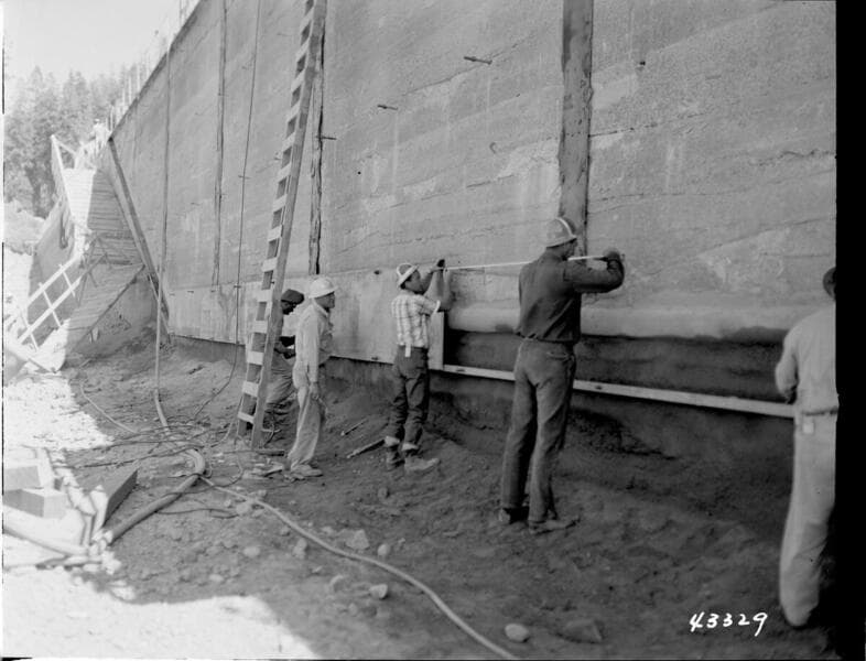 Big Creek, Huntington Lake Dams - Upstream protection - Steel facing being placed in test section at east end of Dam #1. Bottom of section at elvation 6930.