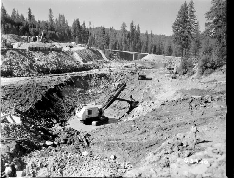 Portal Powerhouse - View from highway bridge showing excavation progress in tailrace channel section isolated by diverting flow into Potter Creek Tunnel.