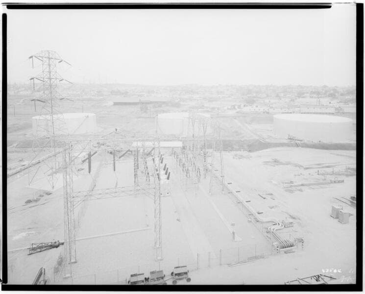 Redondo Beach Steam Station - Plants 2-5 - 220kV transformers & 4160 Volt switchgear - looking east.