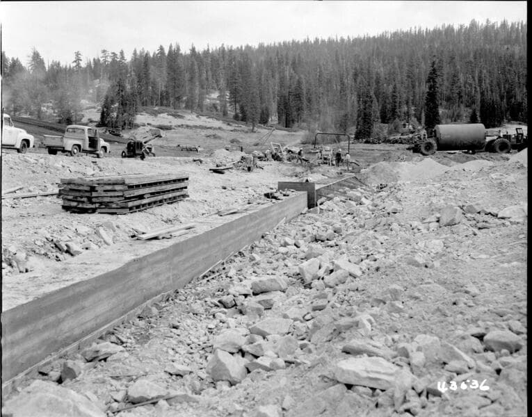 Portal Powerhouse - Forebay - Preparation for rolling 24" diameter sluice pipe in place at forebay dam.