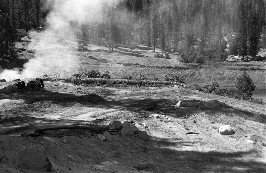 Portal Powerhouse - Forebay - View from left abutment showing progress in reservoir clearing and borrow pit stripping. Portion of new road location in background to right of center.