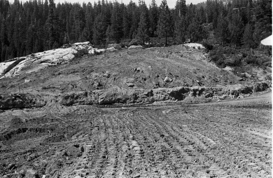 Portal Powerhouse - Forebay - Placing first fill in impervious section under location of sluice pipe. Note dozer pushing layer of saturated & disturbed surface material, exposing firm foundation, before fill placement.