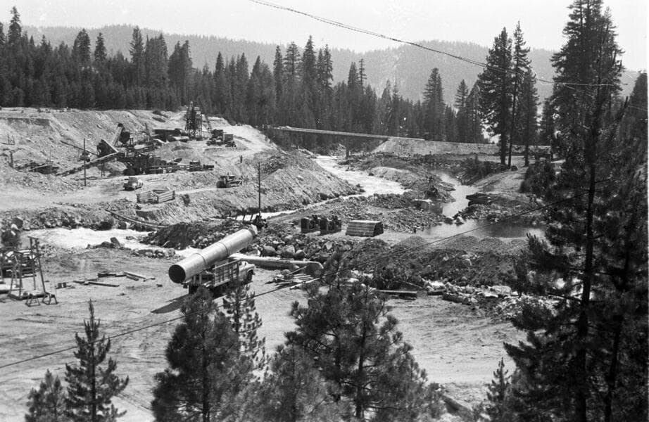 Portal Powerhouse - Tailrace channel excavation view from highway bridge. Boulders ready for shooting.