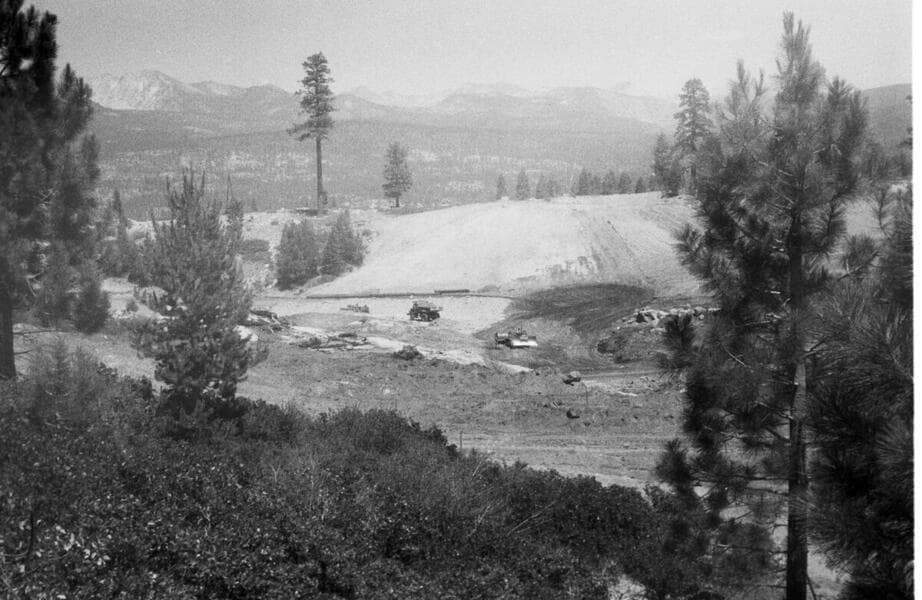 Portal Powerhouse - Forebay - View of portion of reservoir stripped for borrow and left section of damsite, from new Forest Service road.