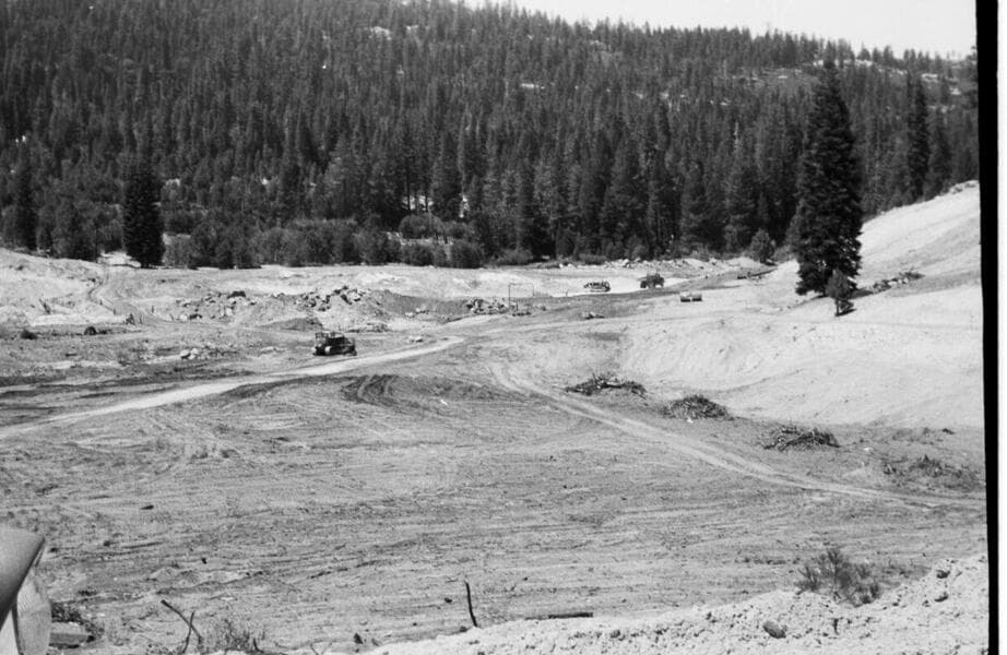 Portal Powerhouse - Forebay - View of portion of reservoir stripped for borrow and left section of damsite, from new Forest Service road.
