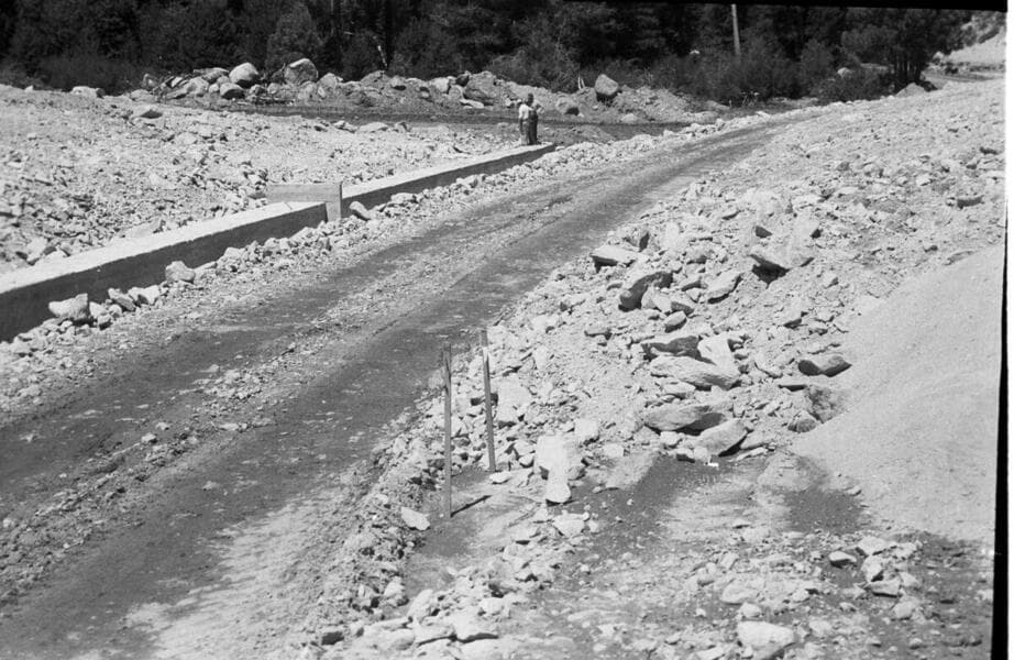 Portal Powerhouse - Forebay - Placing earthfill upstream from sluice pipe.