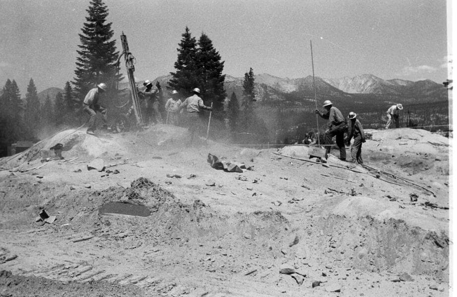 Portal Powerhouse - Forebay - Cleaning and trimming rock foundation for spillway crest concrete.