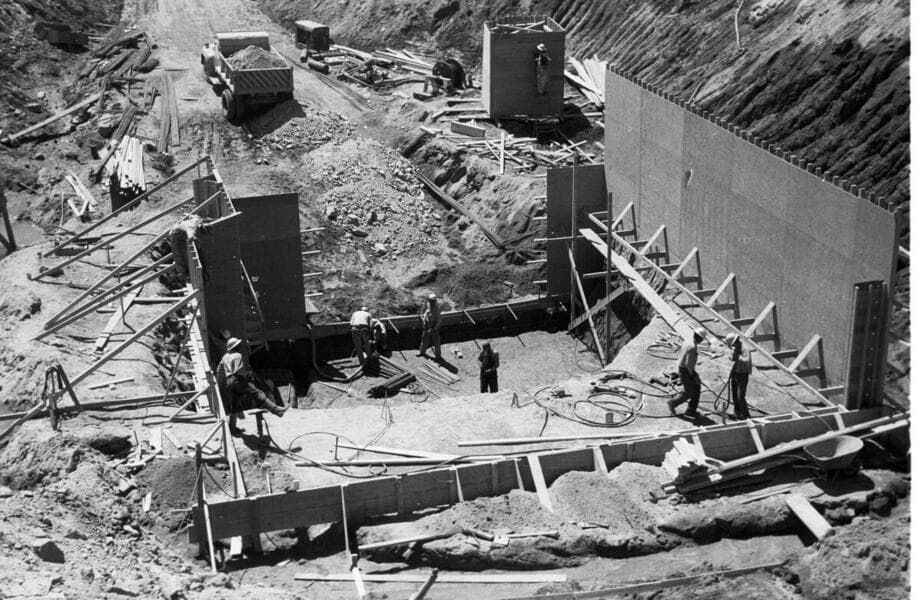 Portal Powerhouse - Forebay - Showing forms for concrete spillway crest.
