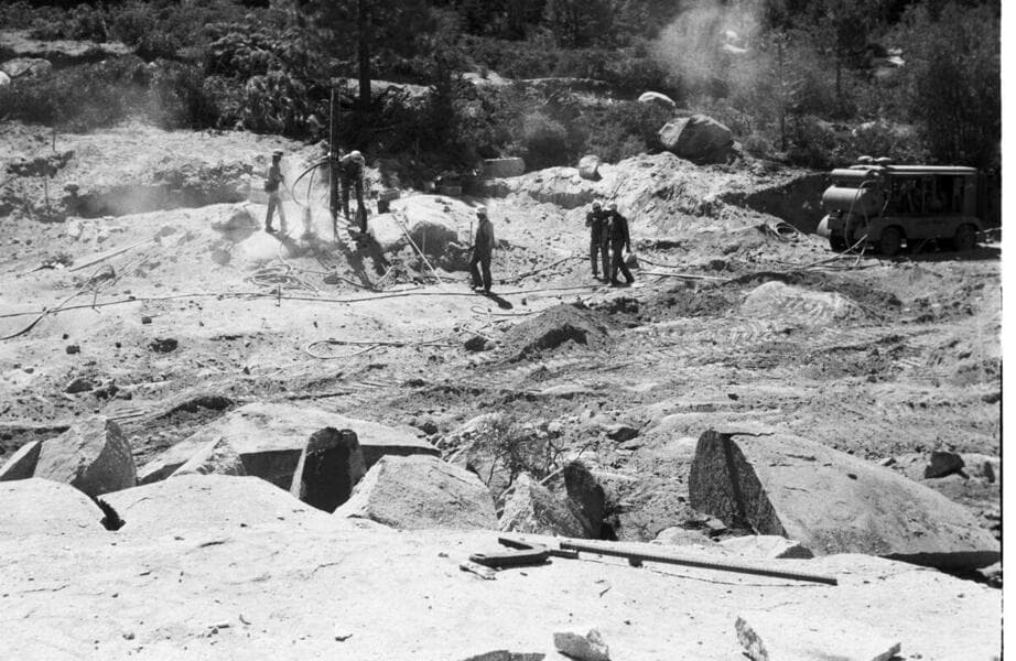 Portal Powerhouse - Forebay - Cleaning and trimming rock foundation for spillway crest concrete.