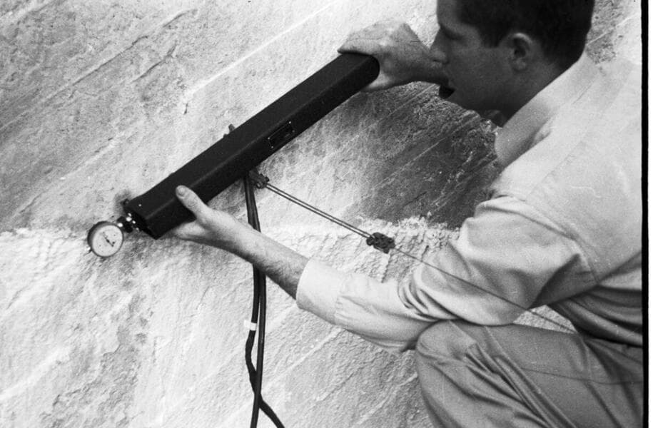 Big Creek, Florence Lake Dam - Arch 21 deflection measurements - note cable reaching from monument up to gage plug in arch near wire thermometer leads.