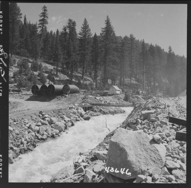 Portal Powerhouse - Potter Creek channel used as temporary diversion. View from Hwy Bridge looking upstream.