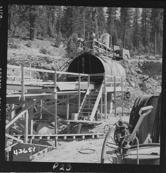 Portal Powerhouse - Penstock pipe in cribbing near outlet of Ward Tunnel welded together into pulling sections for installation in tunnel after start of outage.