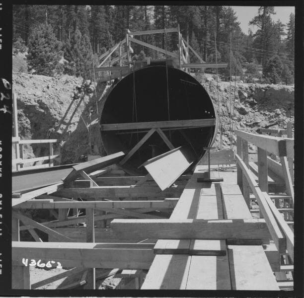 Portal Powerhouse - Outer end of 12' pipe showing install of I-beams for supporting penstock.