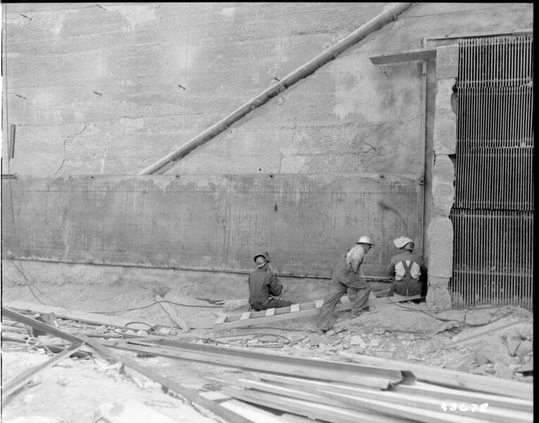 Big Creek, Huntington Lake Dams - Placing concrete in back of steel sheets in section adjacent to 72" sluice gate