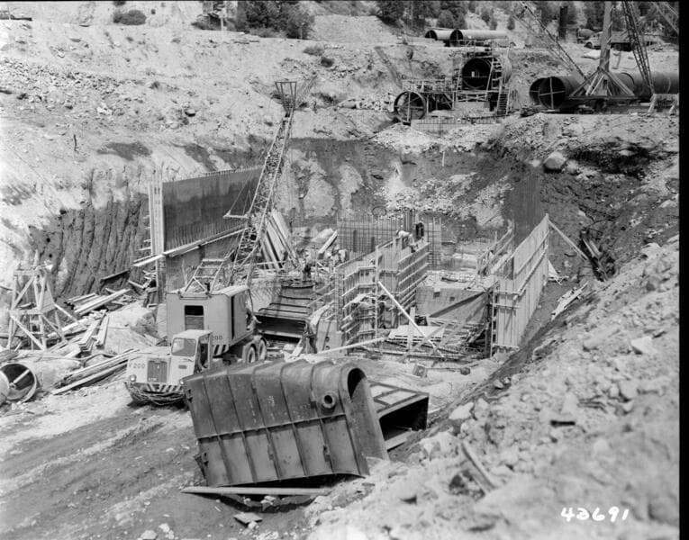 Portal Powerhouse - Progress picture Portal, Phoenix Const. Co., rock crusher at left. [Ward Tunnel outlet and exposed section upstream where cut will be made for diversion]