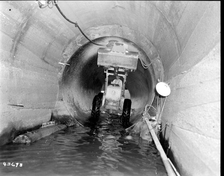 Portal Powerhouse - Excavating rock shot out of 15' plug. Left remaining at bottom of surge chamber shaft until after tunnel outage. D-4 [?] in tunnel loading into skip operated by Bay Cities Crane at top of shaft.