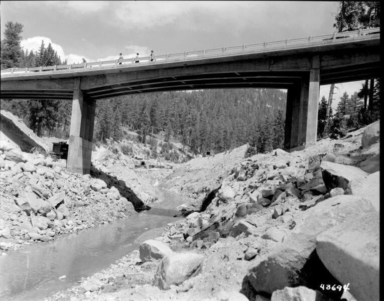 Portal Powerhouse - View to highway bridge with tailrace channel excavation readying large boulders for blasting.