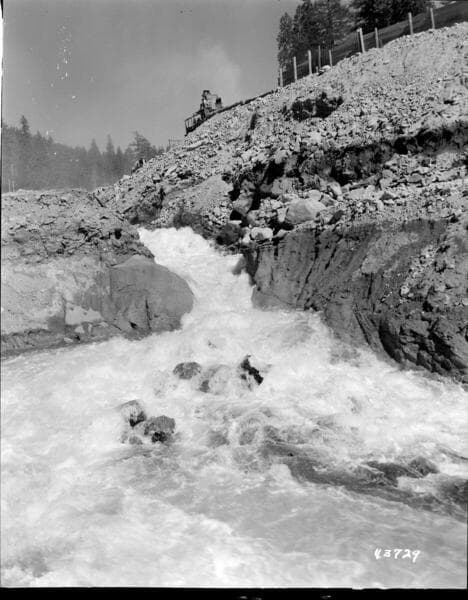 Portal Powerhouse - Test flow of 490 c.f.s. through the enlarged Rancheria Creek channel.