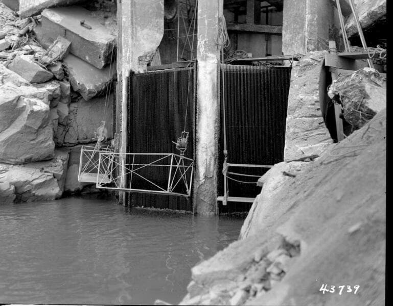Big Creek Powerhouse #3 - Dam 6 - Cleaning rack bars in trash rack [on Tunnel #3 intake].