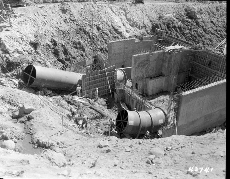Portal Powerhouse - Placing concrete in supporting wall under end of 12' diameter pipe. Excavating old concrete anchor. [Forming new] foundation & Wye branch anchor.