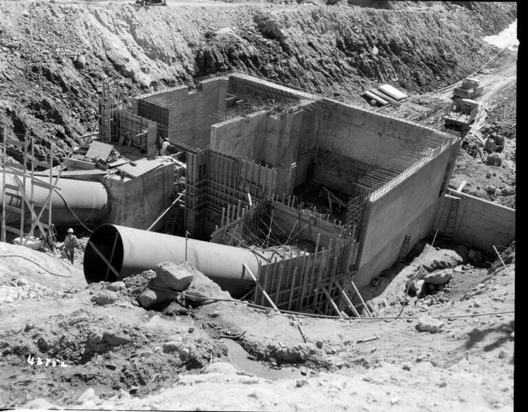 Portal Powerhouse - Placing concrete in supporting wall under end of 12' diameter pipe. Excavating old concrete anchor. [Forming new] foundation & Wye branch anchor.
