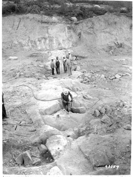 Portal Powerhouse - Forebay - Drilling rock for spillway excavation as seen from dam abutment.