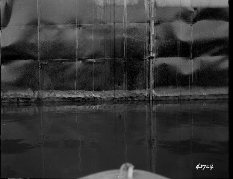 Big Creek, Huntington Lake Dams - First work along bottom of steel facing at elevation 6850. Water approx. elev. 6849.