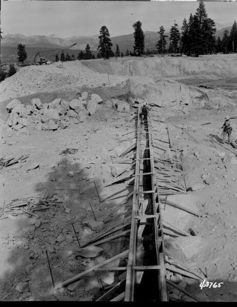 Portal Powerhouse - Forebay - Cleaning and trimming rock foundation for spillway crest concrete.