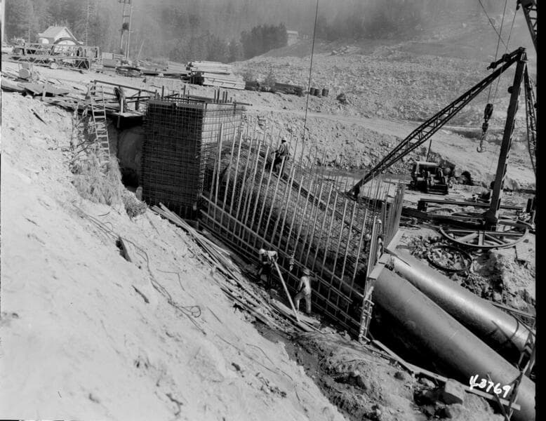 Portal Powerhouse - Placing concrete in supporting wall under end of 12' diameter pipe. Excavating old concrete anchor. [Forming new] foundation & Wye branch anchor.