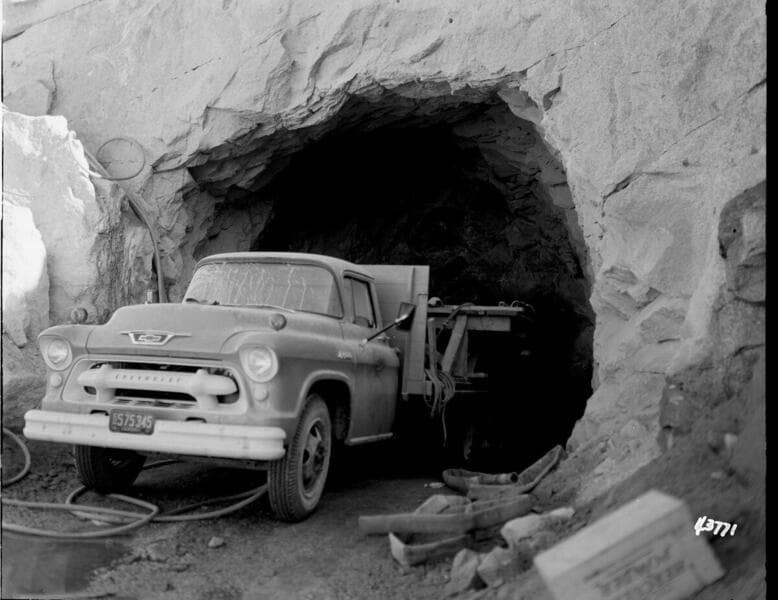 Big Creek, Huntington Lake Dams - Portal Forebay - Drilling 1st round of holes in portal face of short tunnel connecting open cut channel to Ward Tunnel through vertical shaft in adit.