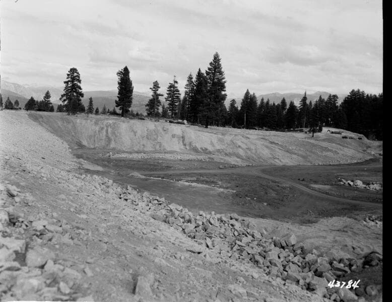 Portal Powerhouse - Forebay - View from left abutment showing progress in reservoir clearing and borrow pit stripping. Portion of new road location in background to right of center.