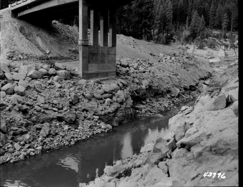Portal Powerhouse - Record pictures of tailrace channel during outage: Upper end of channel and lower end of tunnel diversion channel used during 1955.