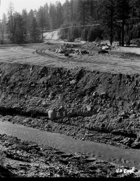Portal Powerhouse - Leveling of spoil area over old Potter Creek channel. Note forest litter spread along north bank of tailrace channel.