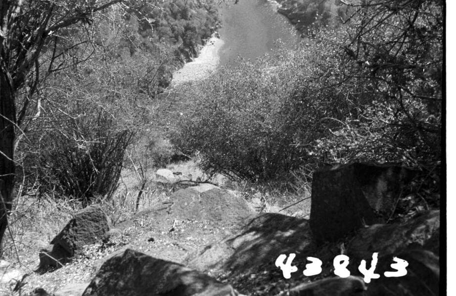 Big Creek, Mammoth Pool - Looking down upper part of penstock line from a point above the tunnel portal.