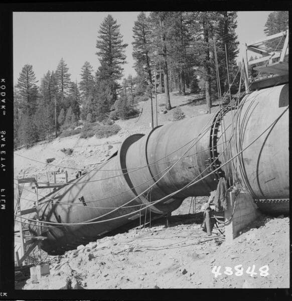 Portal Powerhouse - Placing concrete in supporting wall under end of 12' diameter pipe. Excavating old concrete anchor. [Forming new] foundation & Wye branch anchor.