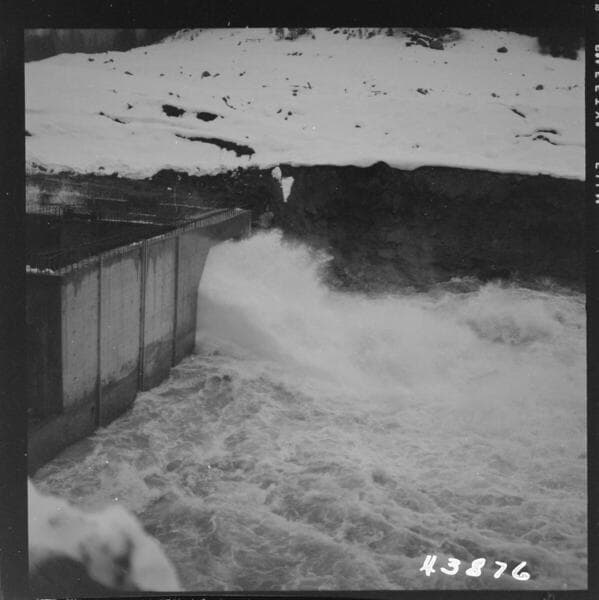 Portal Powerhouse - Flow test - Flow approximately 1200 cfs. - Water spilling at side outlet.