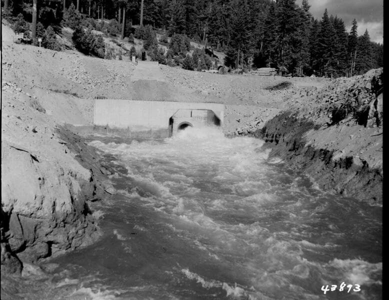 Portal Powerhouse - Discharge at side - channel spillway at approximately 1500 cfs flow thru tunnel.