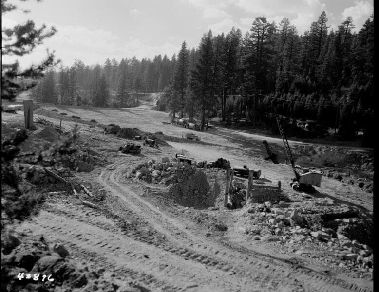Portal Powerhouse - View from highway bridge showing excavation progress in tailrace channel section isolated by diverting flow into Potter Creek Tunnel.