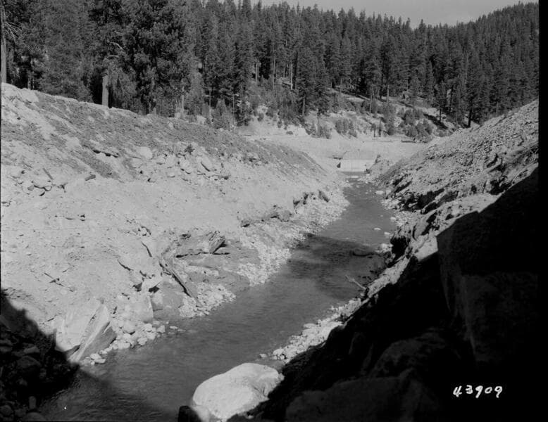 Portal Powerhouse - Tailrace channel from highway bridge. Approx. 1850 cfs flow from Ward Tunnel and Rancheria Creek.