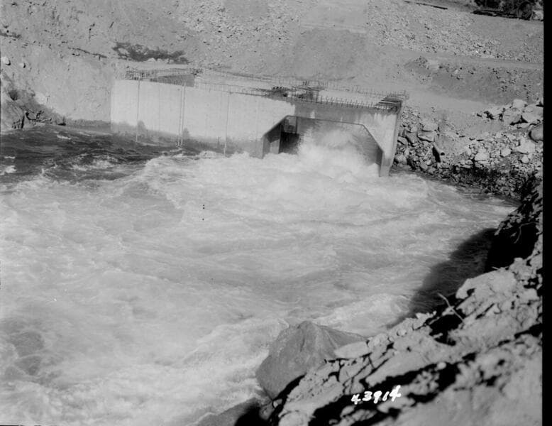 Portal Powerhouse - Discharge at side - channel spillway at approximately 1500 cfs flow thru tunnel.