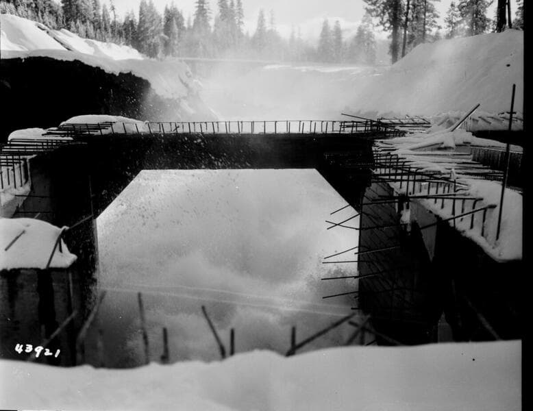Portal Powerhouse - Side Channel Diversion thru openings in 12' diameter pipe - approx. 1700 cfs flow in Ward Tunnel
