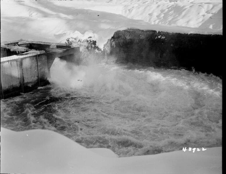 Portal Powerhouse - Discharge at side - channel spillway at approximately 1500 cfs flow thru tunnel.